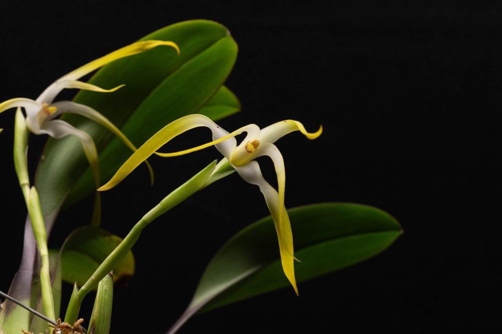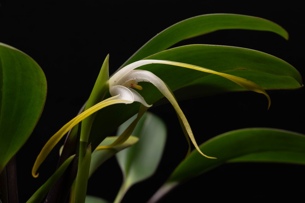 The elegance of the flower is its defining quality — once you manage to see it face-on, despite the downward-hanging habit, it is genuinely striking. The orange lip against the white and yellow petals creates a warmth you don’t easily forget. On fragrance: I went to check mine and couldn’t detect a scent. It’s possible it’s not the right time of day — many orchid fragrances are strongest in the morning and fade by afternoon. Worth investigating at different hours.
