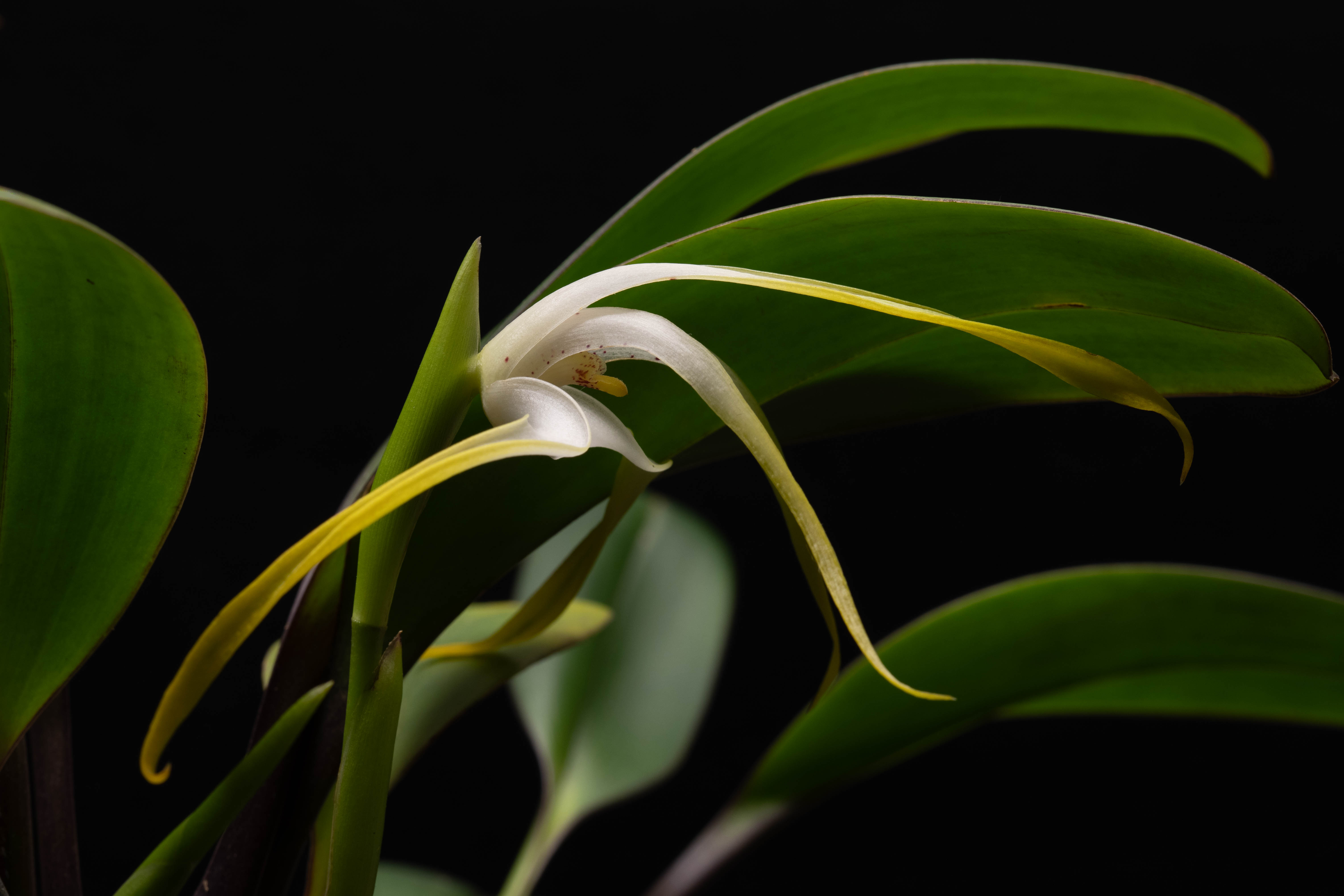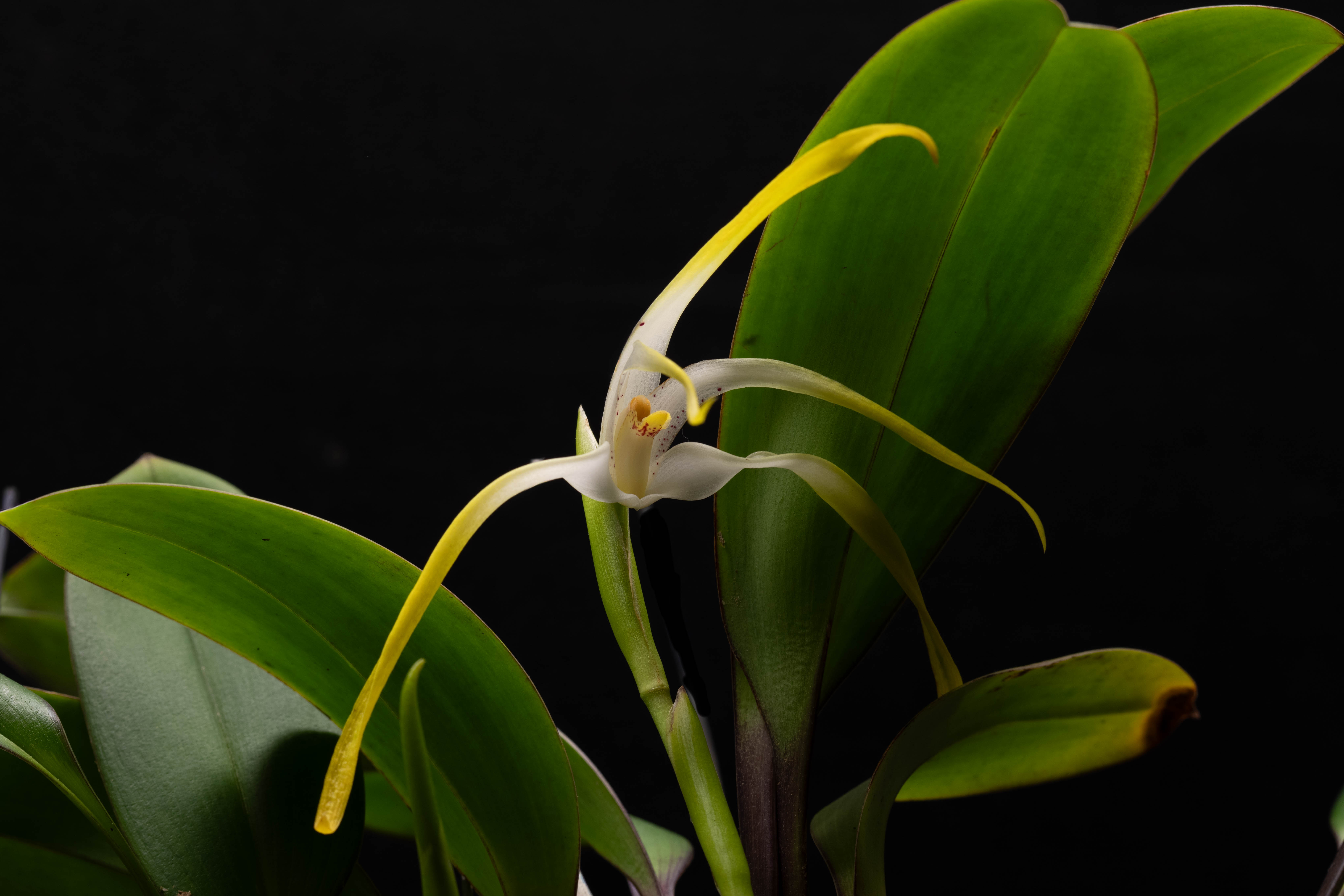 Each inflorescence produces a single flower that can measure up to 12 cm (5 inches) across. The lateral sepals sweep elegantly outward; the dorsal sepal leans forward; and the lateral petals frame the column in a posture that is both structured and graceful. Colouration moves from white — sometimes marked with red blotches — to bright yellow toward the tepal tips. The lip is a vivid orange; the anther cap echoes that warmth.