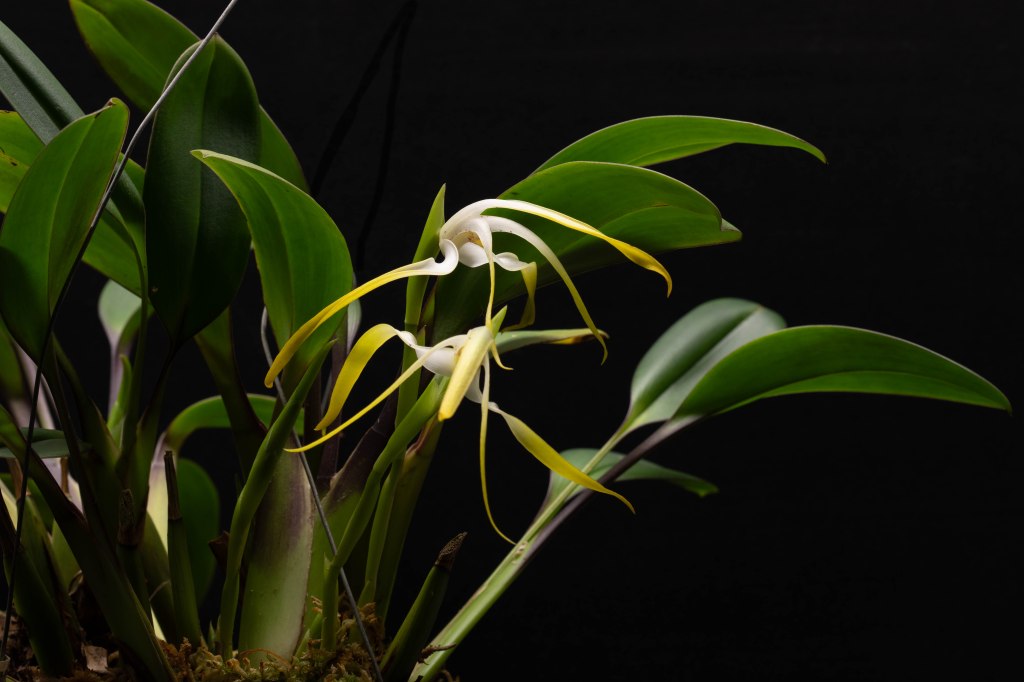 The second bloom was something of a surprise, and I think I know why it happened. I moved the plant out of my intermediate orchidarium and into an IKEA furniture cabinet I am currently converting into an cold orchidarium — with closer LED lighting, high humidity, and I let the medium dry out between waterings.